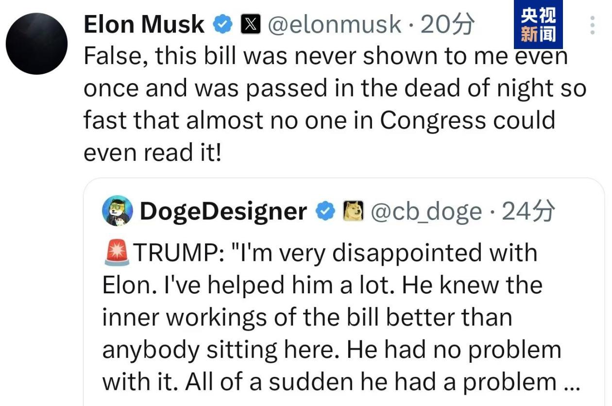 在5月27日,马斯克离开“政府效率部”的前几日,美国哥伦比亚广播公司播出的一档节目中,马斯克第一次发表了其对税改法案的评论。在当时,马斯克的评价还仅仅是“感到失望”。