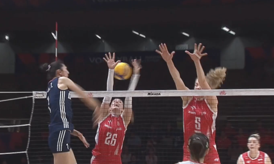 第三局,中国女排开局不利落后,之后迅速调整状态,两队打至11:11平。局中阶段,双方你来我往比分交替上升,此后波兰女排进攻手感越来越火热,分差逐渐拉大。16:22时中国女排请求暂停,但还是无法抑制波兰女排的进攻,最终以19:25输掉本局。