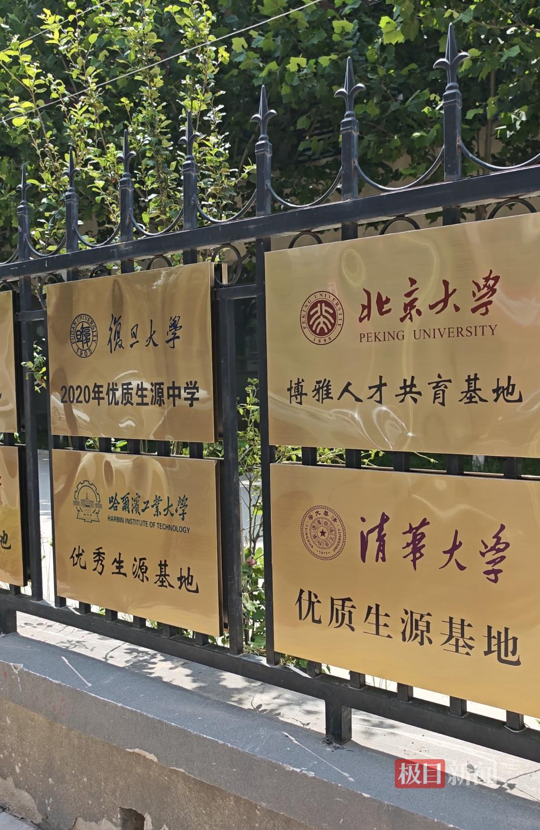极目新闻记者还注意到,在衡水中学北门外的一侧栅栏上,悬挂有北大、清华等一众985、211高校的“优质生源基地”授牌,绵延数十米,颇为耀眼。