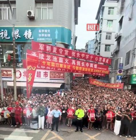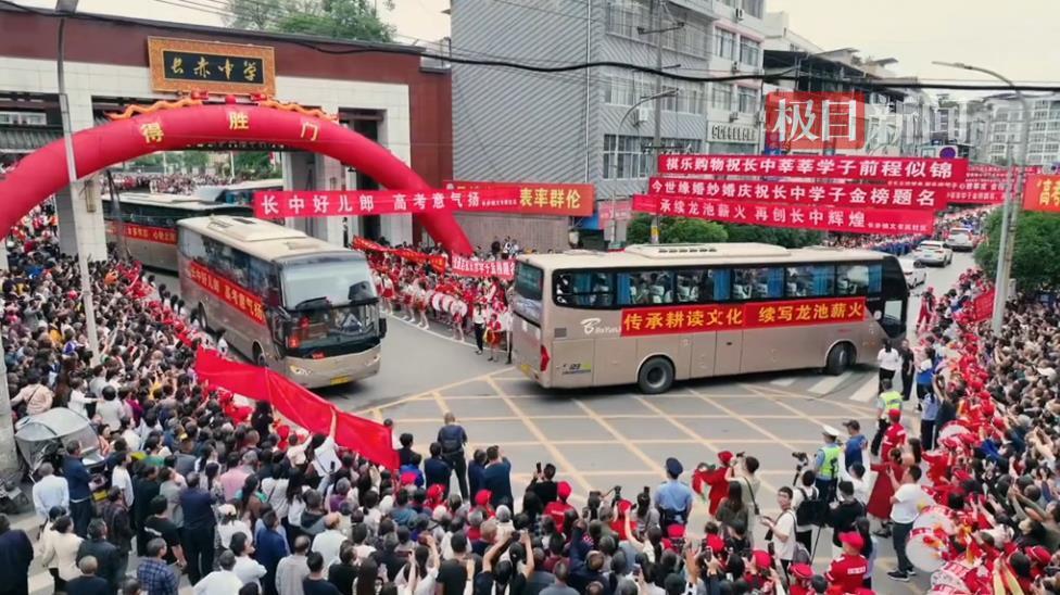 有考生拍摄的第一视角显示,当载有高考生的送考大巴缓缓驶出长赤中学时,道路两旁的家长和居民站满道路两旁,一万多双期待的眼神注视着送考大巴,还有锣鼓队夹道欢迎。路上树满横幅“长中好儿郎,高考意气扬”“十年霜刃寒未试 今朝劈浪斩蛟龙”……
