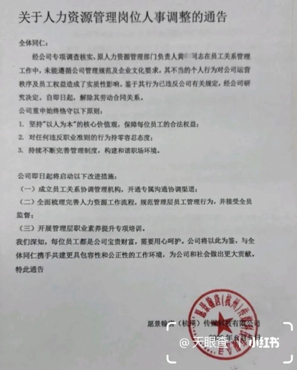 事后,当地人社局工作人员称,他们已经关注到此事并已介入处置。公司方面回应称,只是两人因个人原因吵架。针对涉事HR所说的绩效工资为0等情况,人社局工作人员表示:已和公司对接过,涉事员工不会受到任何处分。随后,愿景娱乐发布通告,以“违反公司规范”为由解除HR黄某的劳动合同,但未向受害员工公开道歉或提及补偿。(据6月6日极目新闻)
