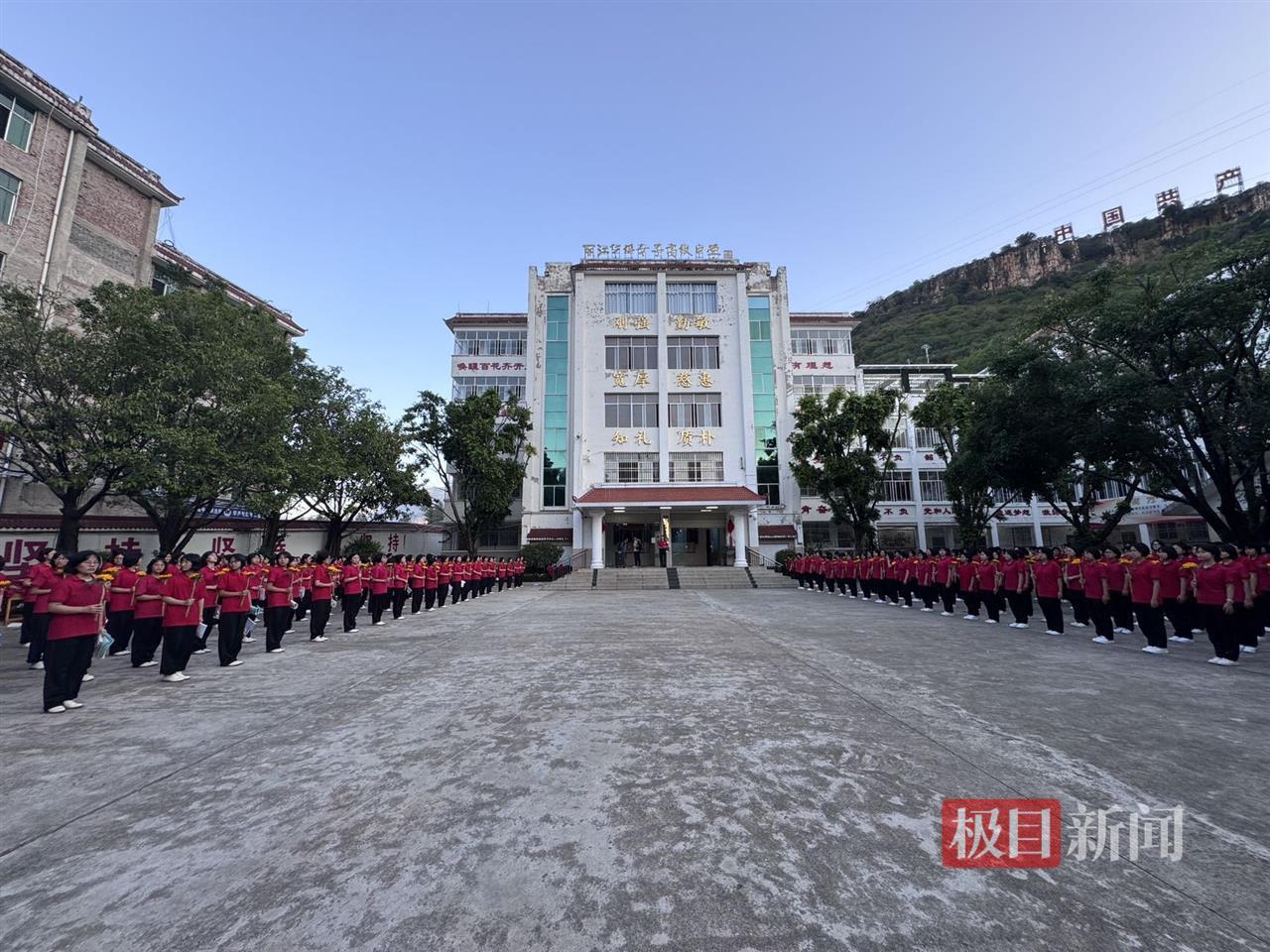 送考仪式上,华坪女高全校师生挥舞着向日葵,一起合唱《万疆》和《英雄赞歌》,还有老师穿上旗袍与消防员跳着青春洋溢的舞蹈,为高三考生们加油打气。