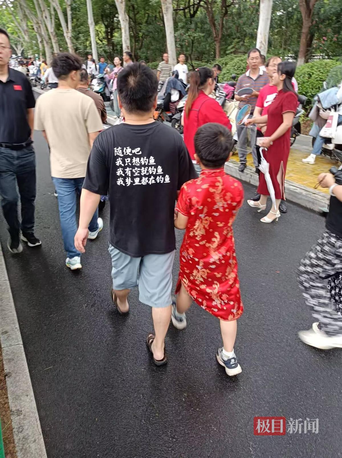 6月7日8时,合肥西藏路四十六中学考点,潘先生夫妻带着10岁的儿子给大女儿送考,为了祝福女儿“旗开得胜”,潘先生特意让儿子穿上红色的旗袍。