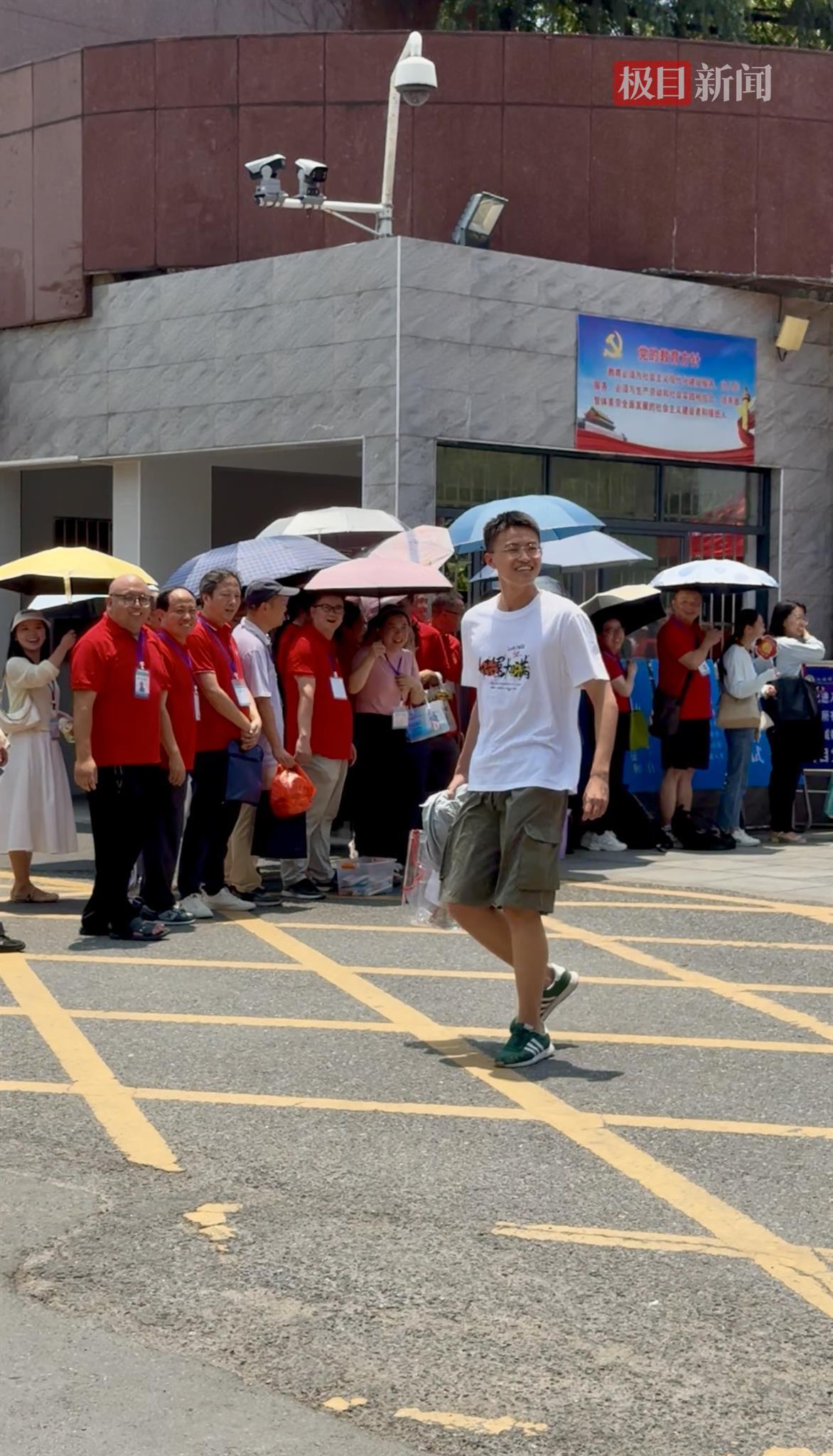 6月7日11时30分许,高考语文结束后,江西师范大学附属中学青山湖校区考点外站满了翘首以盼的家长,在烈日下撑着伞等待自己的孩子。11时40分许,考生陆续从考点内走出,第一个冲出考点的是一位穿白色T恤的高个男生,他的衣服上还印着“好运加满”的字样,他脚步轻快,一边跑一边左顾右盼,喊着:“快采访!快采访!有人要采访我吗?”,但还没等记者上前,他已沿着工作人员清理出的一条快速通道离开。