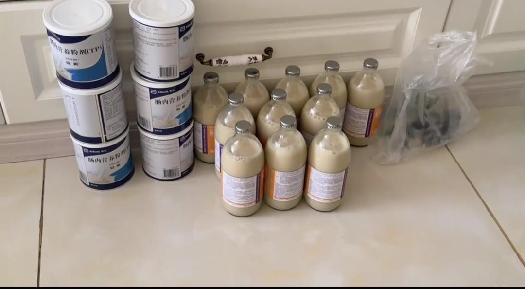 4月底,在医院治疗20多天后,因无法正常吃饭,徐女士每天通过胃管输入肠内营养混悬液(以下简称“营养液”)补充身体所需能量。
