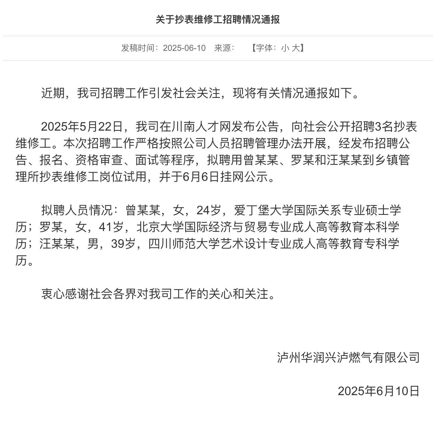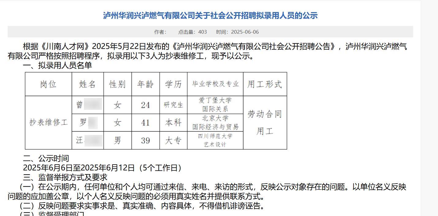 近日,有网友分享了泸州华润兴泸燃气有限公司关于社会公开招聘拟录用人员的公示名单截图。截图显示,公司拟录用3名抄表维修工,一名为24岁的爱丁堡大学国际关系专业研究生,一名为41岁的北京大学国际经济与贸易专业本科生,另一名为39岁的四川师范大学艺术设计专业毕业的大专生,此信息引发关注。