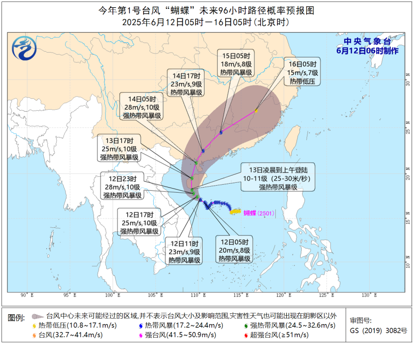 今年第1号台风“蝴蝶”(热带风暴级)的中心今天(12日)早晨5点位于海南三亚东偏南方向大约205公里的海面上,预计,“蝴蝶”将以每小时10公里左右的速度向西北转偏北方向移动,强度逐渐加强,并向海南岛南部沿海靠近,可能于13日凌晨到上午在海南陵水至乐东一带沿海登陆(强热带风暴级,10-11级,25-30米/秒),14日白天在广东西部到广西沿海再次登陆(强热带风暴级,10-11级,25-30米/秒),登陆后转向东北方向移动,强度逐渐减弱。
