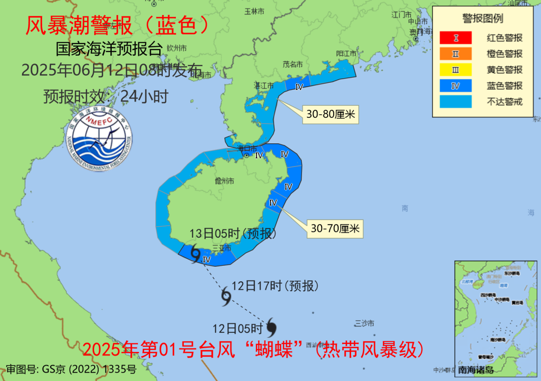 自然资源部透露,受今年第1号台风“蝴蝶”影响,6月12日中午到13日中午,南海西部将出现巨浪到狂浪区,海南东部、南部近岸海域将有大浪到巨浪,海浪警报升级为橙色;同时,广东省、海南省的风暴潮预警级别维持为蓝色。