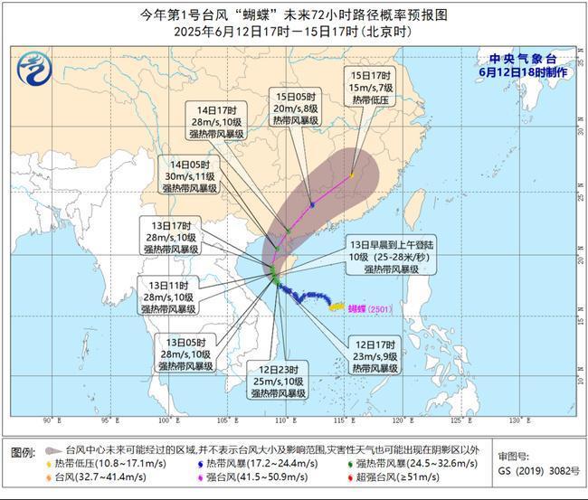 预计,“蝴蝶”将以每小时10公里左右的速度向西北转偏北方向移动,强度逐渐加强,即将于13日早晨到上午在海南三亚至乐东一带沿海登陆(强热带风暴级,10级,25~28米/秒),14日早晨到上午在广东徐闻到广西北海再次登陆(强热带风暴级,10~11级,25~30米/秒),登陆后转向东北方向移动,强度逐渐减弱。