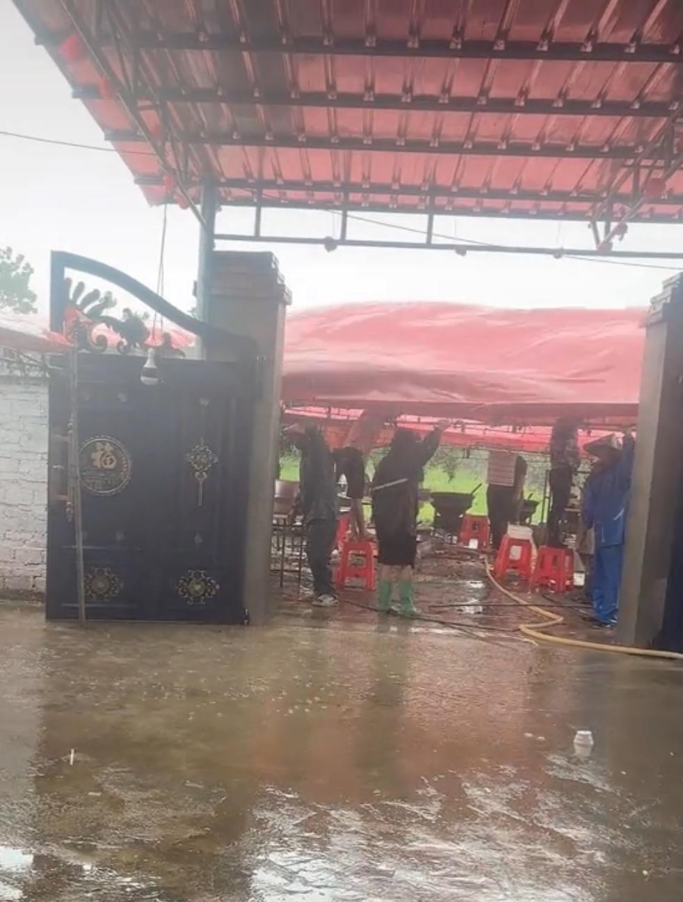 视频显示,新郎新娘撑着伞入场,伴娘们齐齐帮忙拎着新娘的裙子,避免沾到地上的积水。另一段视频显示,风雨呼啸,喜棚顶部的篷布被吹得上下起伏,底下好几个人拉着架子避免棚子不稳。