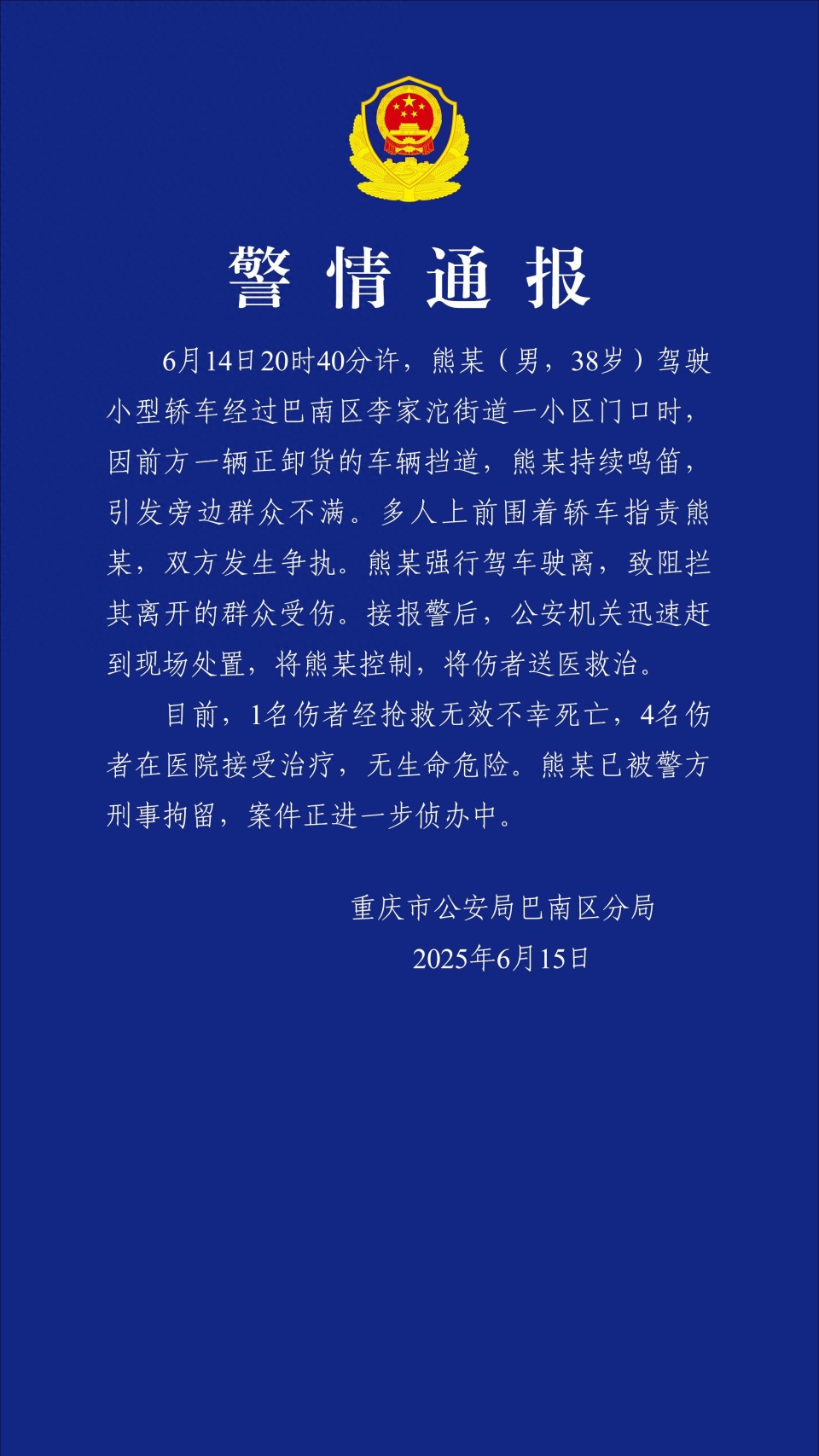 6月14日20时40分许,熊某(男,38岁)驾驶小型轿车经过巴南区李家沱街道一小区门口时,因前方一辆正卸货的车辆挡道,熊某持续鸣笛,引发旁边群众不满。多人上前围着轿车指责熊某,双方发生争执。熊某强行驾车驶离,致阻拦其离开的群众受伤。接报警后,公安机关迅速赶到现场处置,将熊某控制,将伤者送医救治。