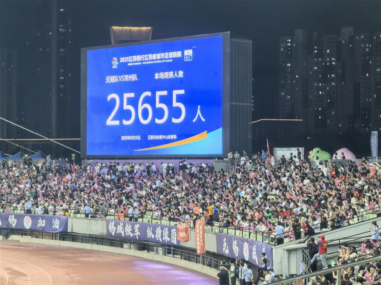 6月15日晚,“苏超”排名倒数一二名常州队、无锡队狭路相逢,最终,无锡队坐镇主场以2:0战胜常州队,取得了苏超联赛开赛以来的首次胜利。本场比赛吸引了25655名观众到场。