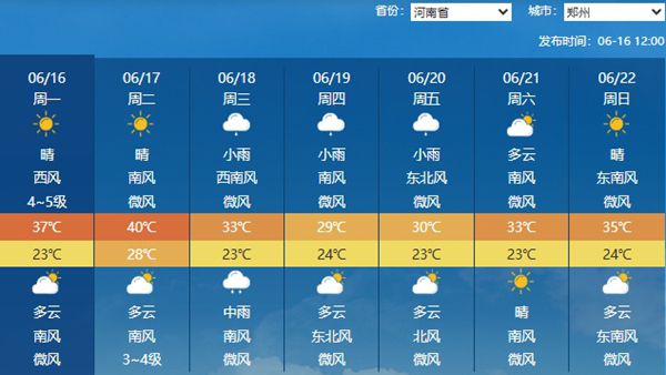 河南则会是明天最为酷热的地方,不但38℃以上的高温会较为常见,像开封、许昌等地都是如此;并且中北部局地最高气温将达40℃以上,像郑州,最高气温就会达到40℃。
