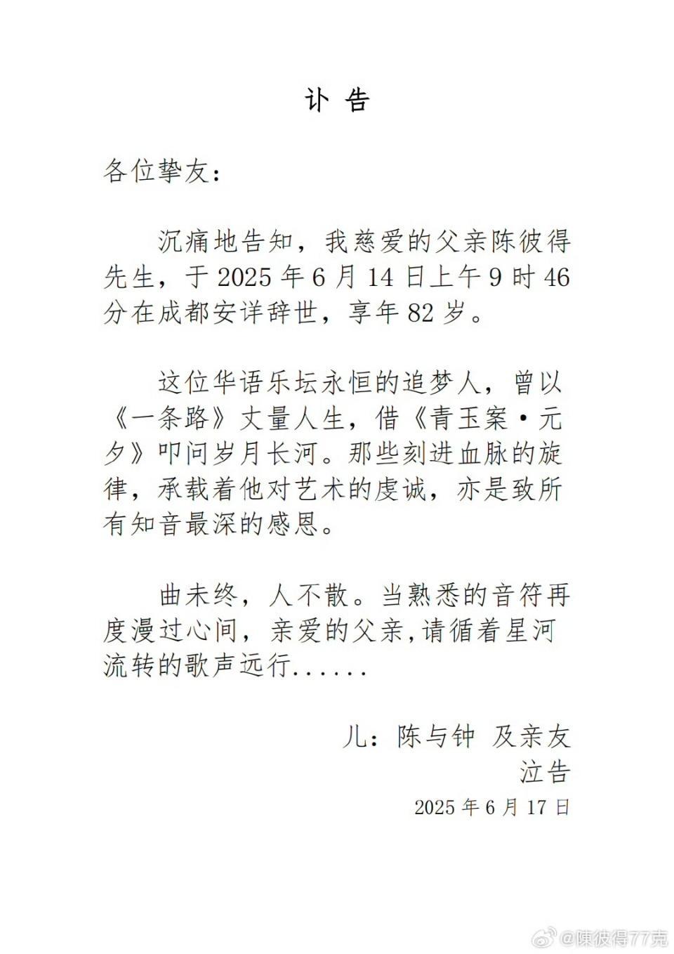 沉痛地告知,我慈爱的父亲陈彼得先生,于2025年6月14日上午9时46分在成都安详辞世,享年82岁。