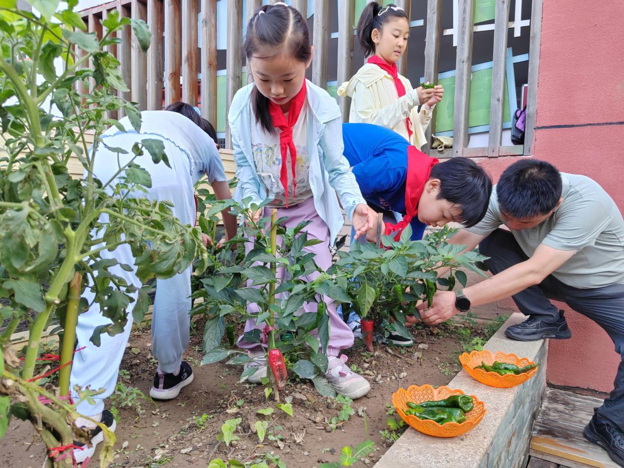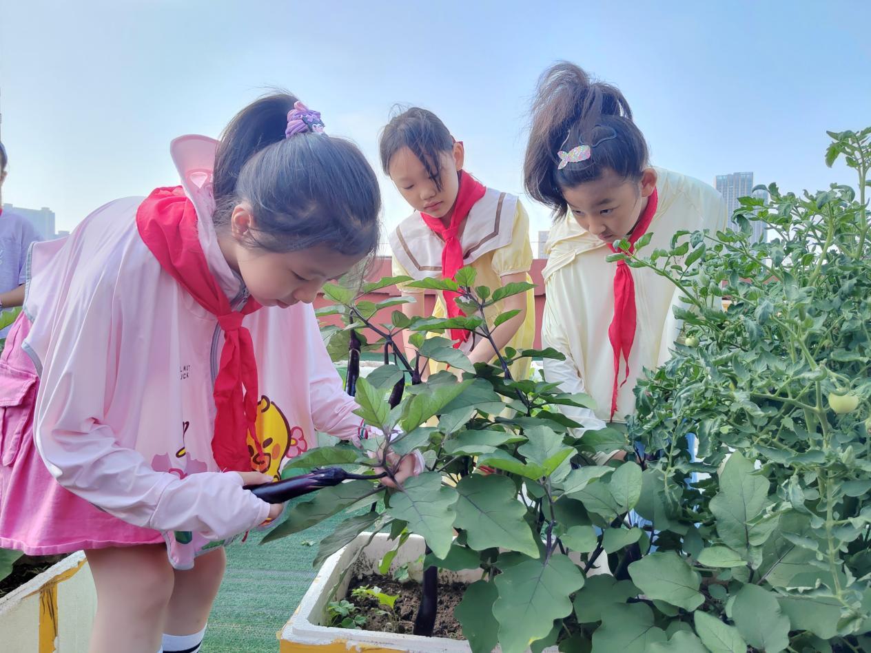 孩子们手提篮子,穿梭在“田埂”之间,小心翼翼地采摘成熟的茄子、辣椒等,或轻轻捧在手心,或整齐地放进篮子,或展示劳动成果,或分享丰收的喜悦。