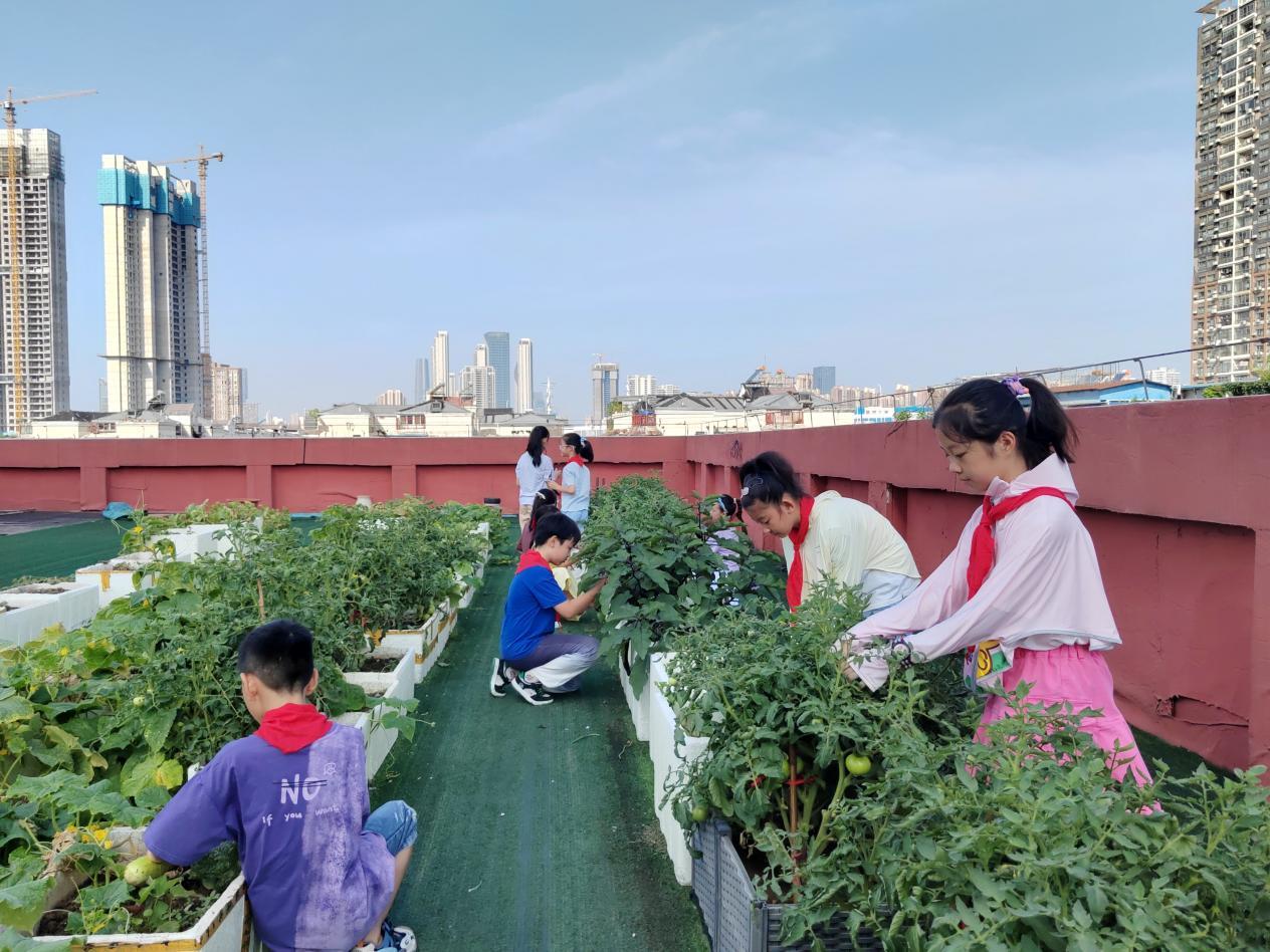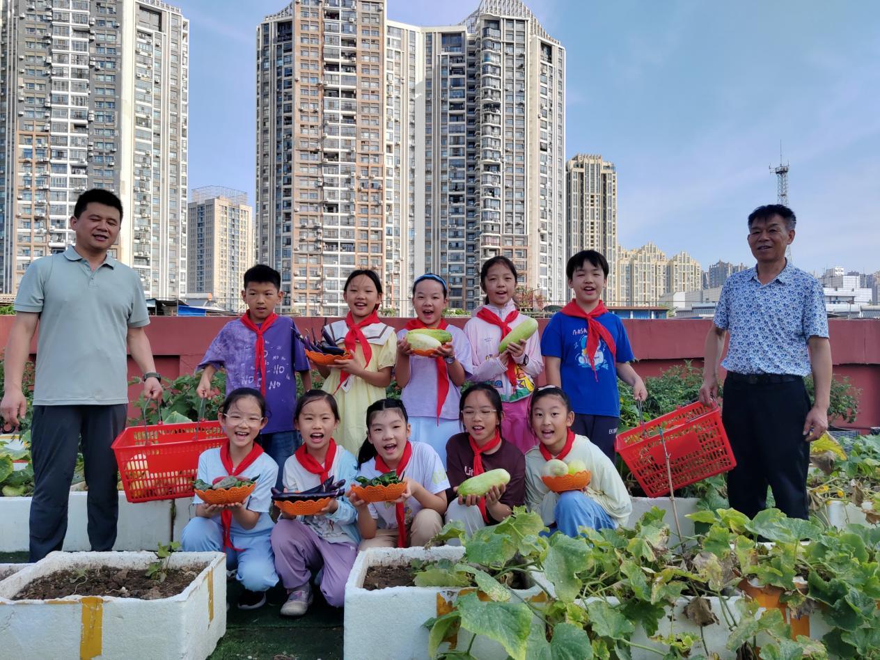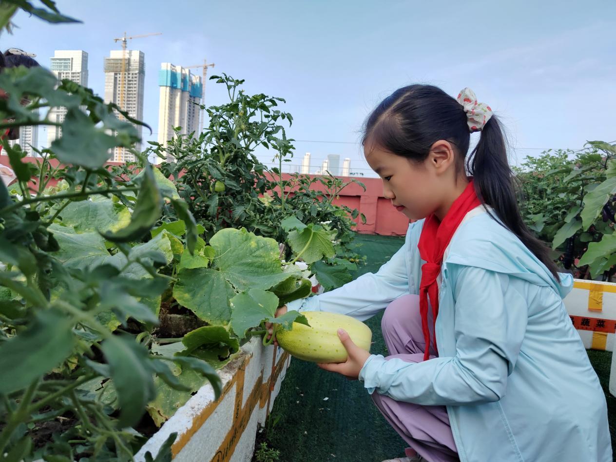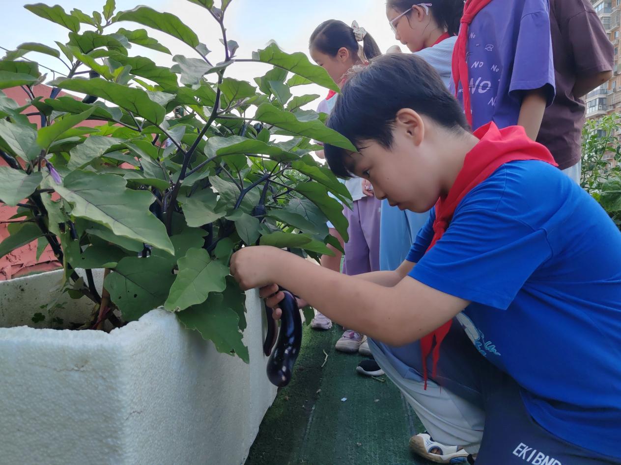钢都小学“七彩”农场里,楼顶一块块“小菜园”被精耕细作,四年级每个班分到3—4个种植箱,分别种上了不同作物:1班黄瓜、2班茄子、3班辣椒……同学们此前在这里亲手种植、浇水、除虫、拔草……才迎来了今天的硕果累累。骄阳下,一张张小脸虽然晒红了,挂上了大颗汗珠,却乐此不疲。