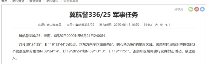 据中国海事局网站消息,唐山海事局发布航行警告,6月20日0时至6月21日24时,渤海部分海域进行实弹射击活动,禁止驶入。