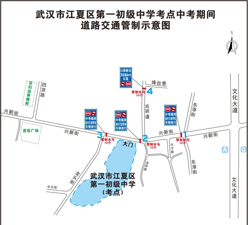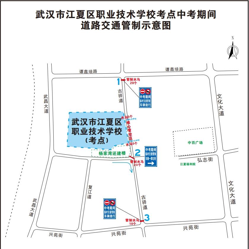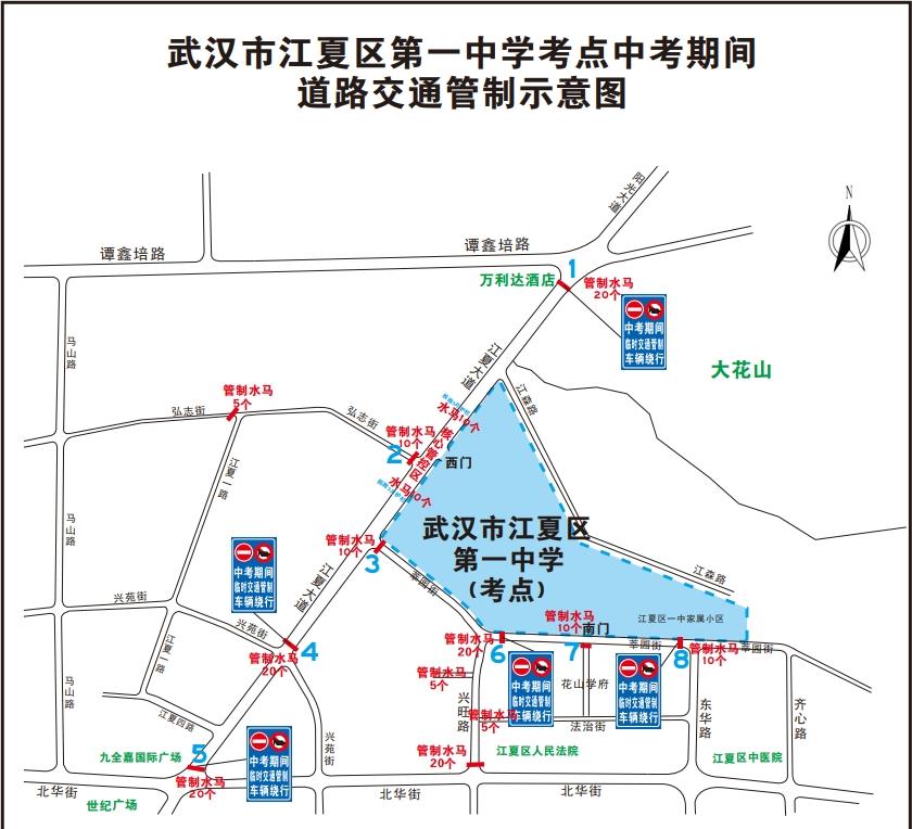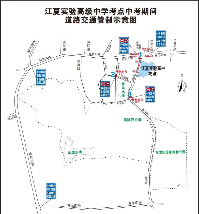 三角岛万利达酒店路口、江夏大道与北华街路口临时交通管制,允许持有准考证的送考车辆进入江夏大道,车辆到江夏一中大门(西门)南、北两侧30米处,考生下车后车辆即停即走,送考车辆有序调头驶离,其他社会车辆请提前绕行。