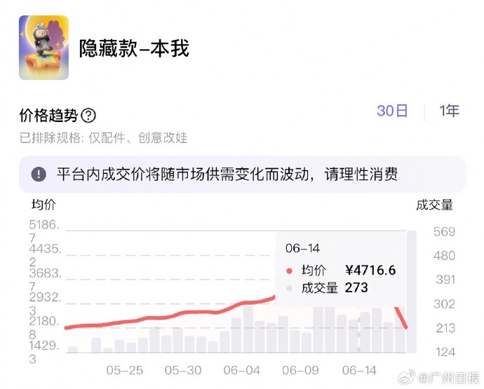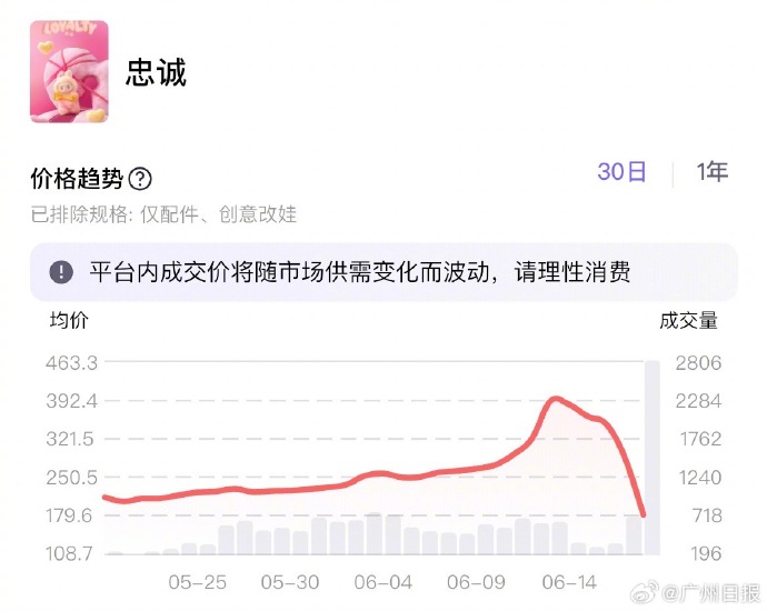 根据某潮玩二手交易软件的数据,该系列盲盒价格普遍下跌约50%。有网友向记者反映,在其所在的补货信息群聊中,曾有人以2600元的价格出售该系列全套盲盒,“但一直无人问津。最后卖家将价格降至800元,我估计也难成交。”