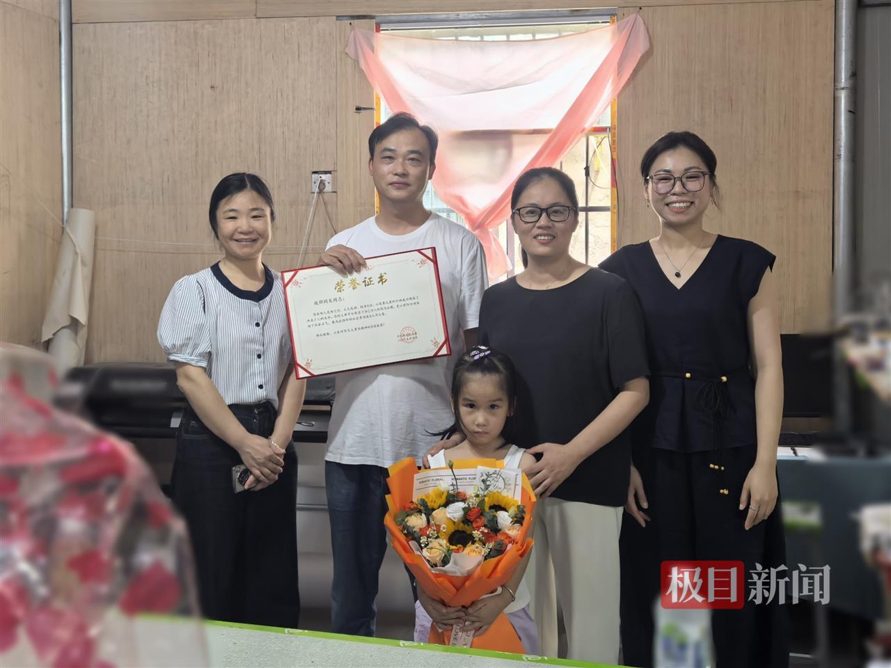 海宁市许村镇相关部门给邵同发送上荣誉证书(左2、3分别为邵同发和他6岁的女儿)