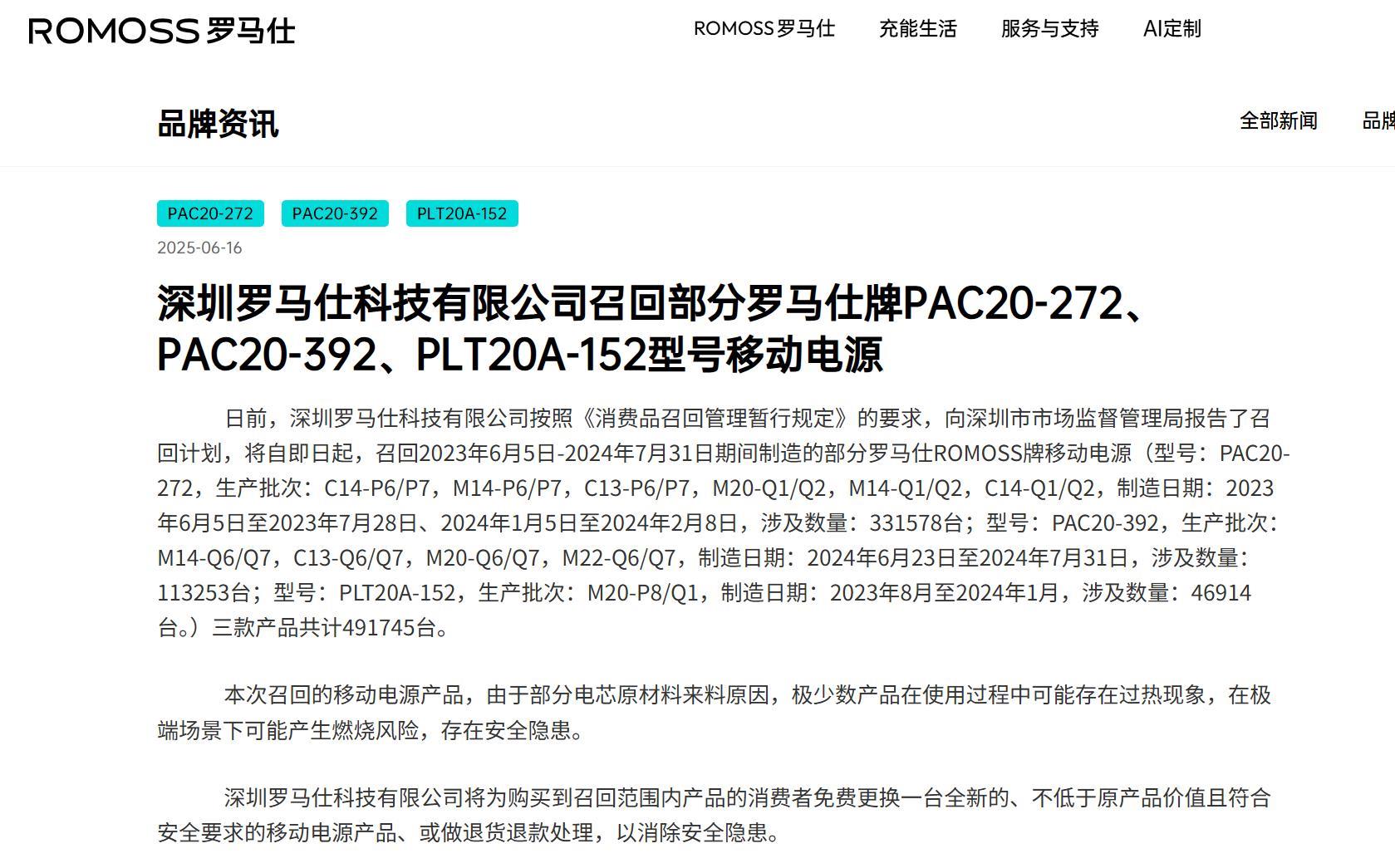 日前,深圳罗马仕科技有限公司按照《消费品召回管理暂行规定》的要求,向深圳市市场监督管理局报告了召回计划,召回的三款产品共计491745台。召回2023年6月5日至2024年7月31日期间制造的部分罗马仕ROMOSS牌移动电源。原因是召回的移动电源产品,由于部分电芯原材料来料原因,极少数产品在使用过程中可能存在过热现象,在极端场景下可能产生燃烧风险,存在安全隐患。