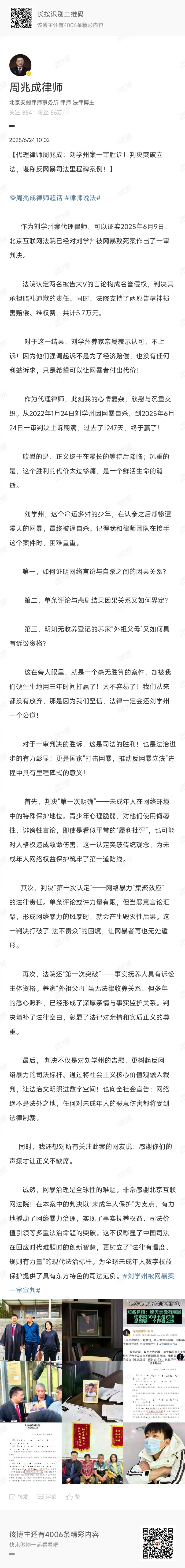 6月24日,刘学州案代理律师@周兆成律师公布“刘学州网暴致死案”最新进展: