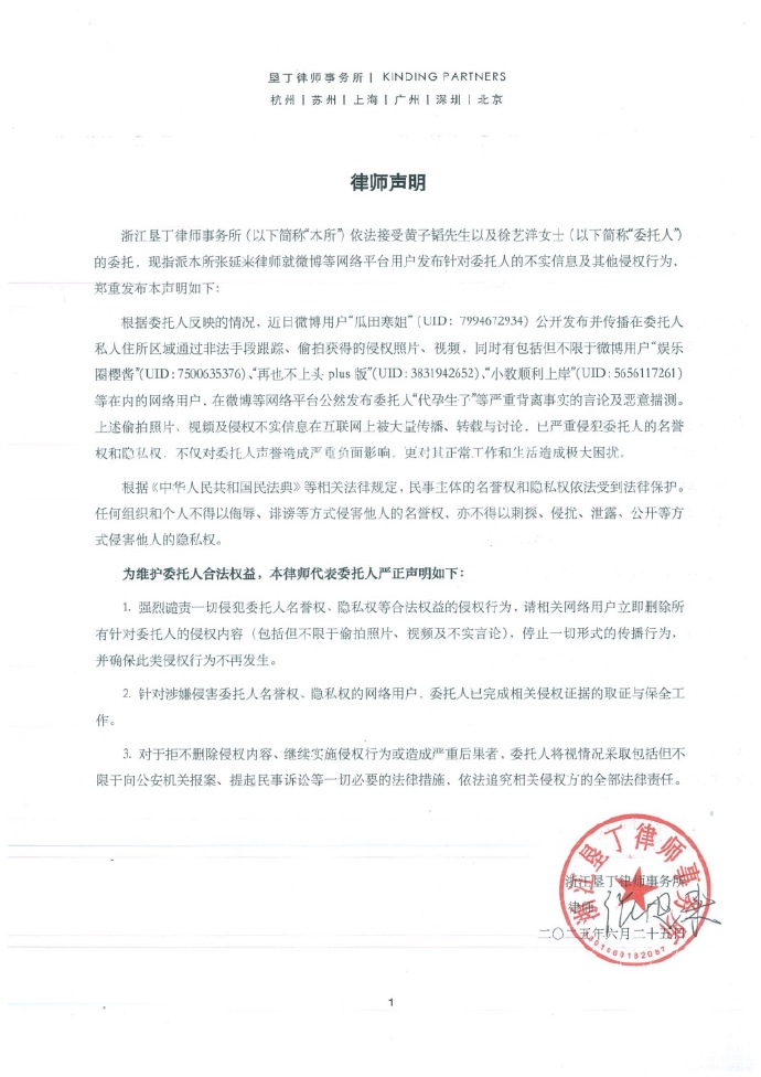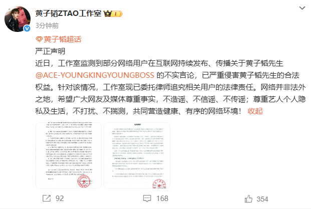 6月25日,黄子韬工作室发布严正声明:近日,工作室监测到部分网络用户在互联网持续发布、传播关于黄子韬先生的不实言论,已严重侵害黄子韬先生的合法权益。针对该情况,工作室现已委托律师追究相关用户的法律责任。网络并非法外之地,希望广大网友及媒体尊重事实,不造谣、不信谣、不传谣;尊重艺人个人隐私及生活,不打扰、不揣测,共同营造健康、有序的网络环境!