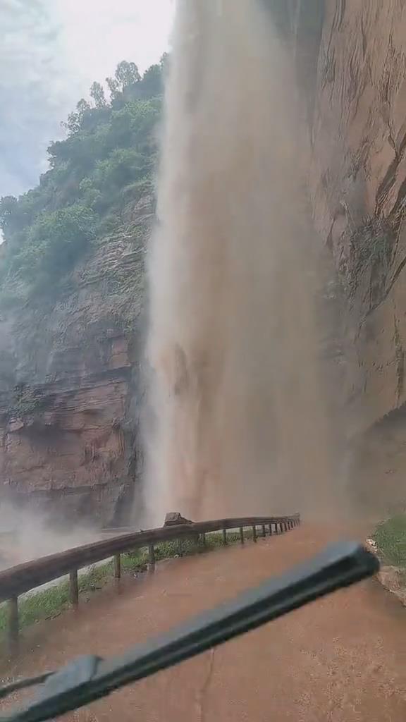近日,一名网友在社交网站发布的视频显示,她乘坐的车辆在一处位于山脚的公路行驶,前方是一道数百米高的瀑布,大量混合泥沙的水向下直冲向公路的外侧。这一景象让该网友直呼“吓人”。不过,她乘坐的车仍继续向前行驶,从瀑布下方穿过。穿行过程约耗时30秒,挡风玻璃持续被水覆盖,人在车内看不清前方的情况。