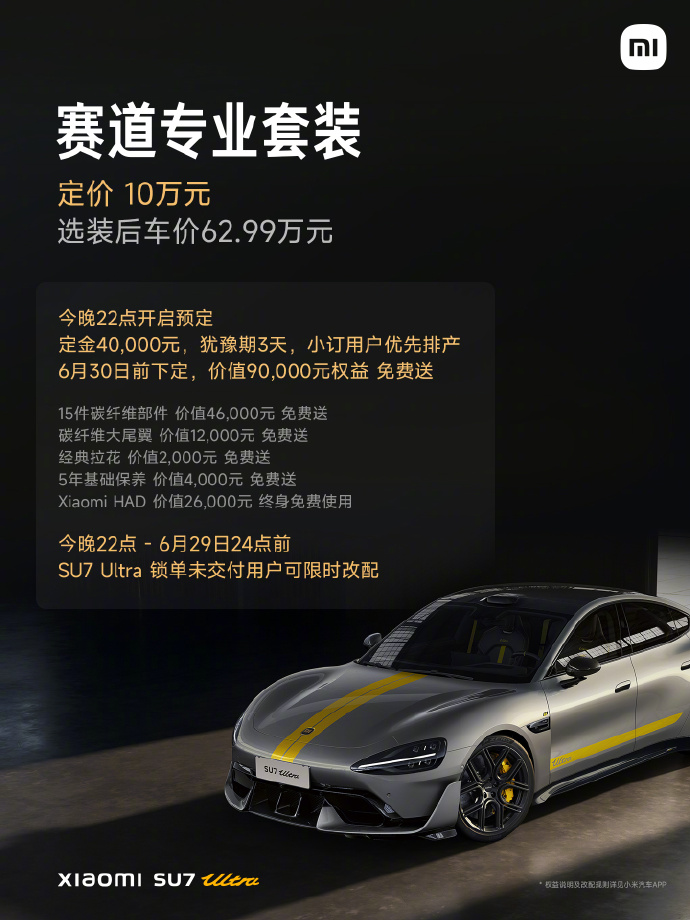 6月26日晚,据@小米公司 发布,小米SU7 Ultra纽北限量版今晚22:00开启预定!