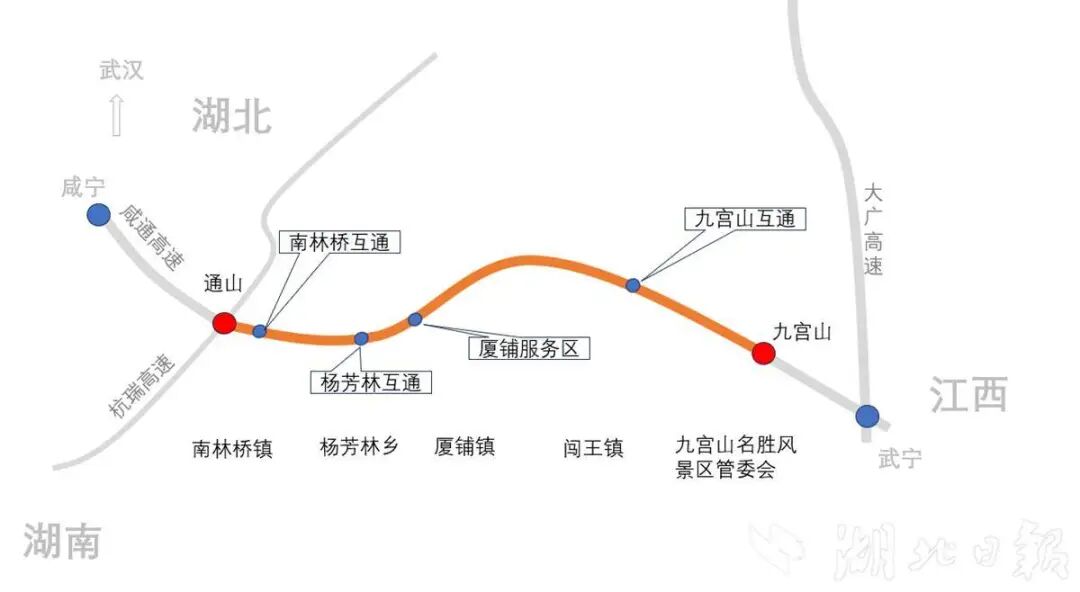 “这是一条畅连武汉都市圈和环鄱阳湖城市群的中部大通道,加快推动湖北区域联动战略。”指着江西方向,咸宁市交通运输局局长彭光平说,咸宁通山至九江武宁高速公路湖北段起于通山县南林桥镇,与已建成的咸通高速、杭瑞高速相接,向东南延伸至九宫山风景区,与正在建设中的江西省九江市武宁县大广高速、永武高速对接。