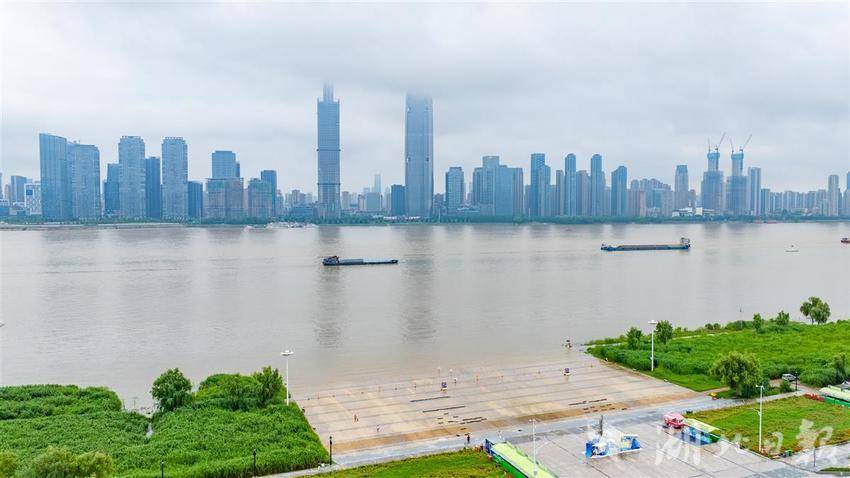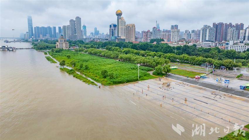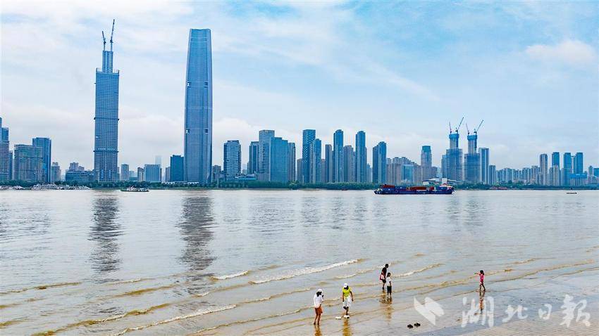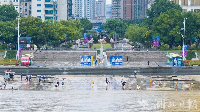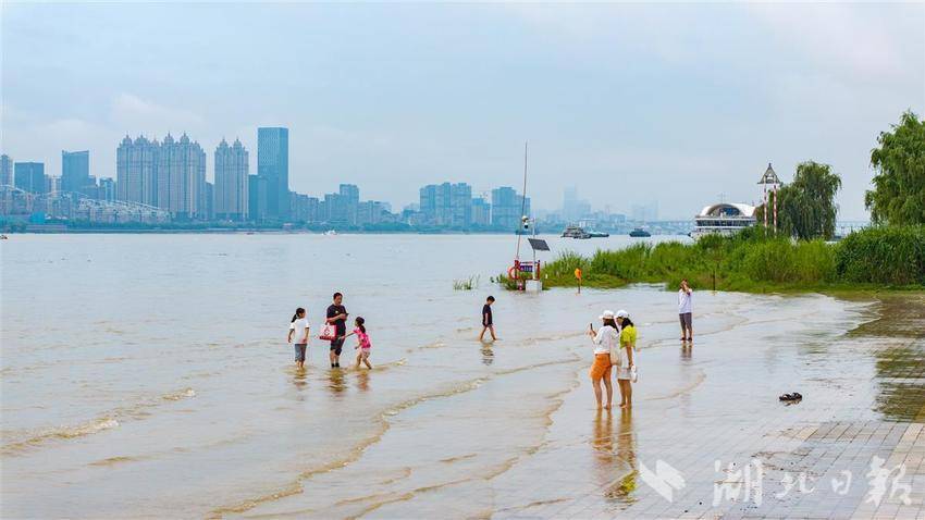 2025年6月26日,受连日降雨天气和上游来水影响,长江汉口站水位达到22.96米,直逼23米,在武汉市汉口江滩,江水已经淹没了部分底层瓷砖,引得不少市民游客前来戏水游玩。(湖北日报全媒记者 何宇欣 摄)
