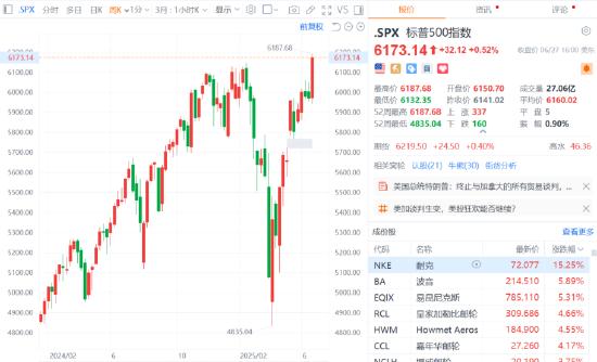 财联社6月28日电,美股三大指数集体收涨,道指涨1%,本周累涨3.82%;标普500指数涨0.52%,本周累涨3.44%;纳指涨0.52%,本周累涨4.25%。其中,标普500指数、纳指均创历史新高。大型科技股多数上涨,谷歌、亚马逊涨超2%,英伟达、Meta涨超1%,苹果、英特尔小幅上涨;特斯拉、微软小幅下跌。耐克涨超15%,创四年来最大单日涨幅。