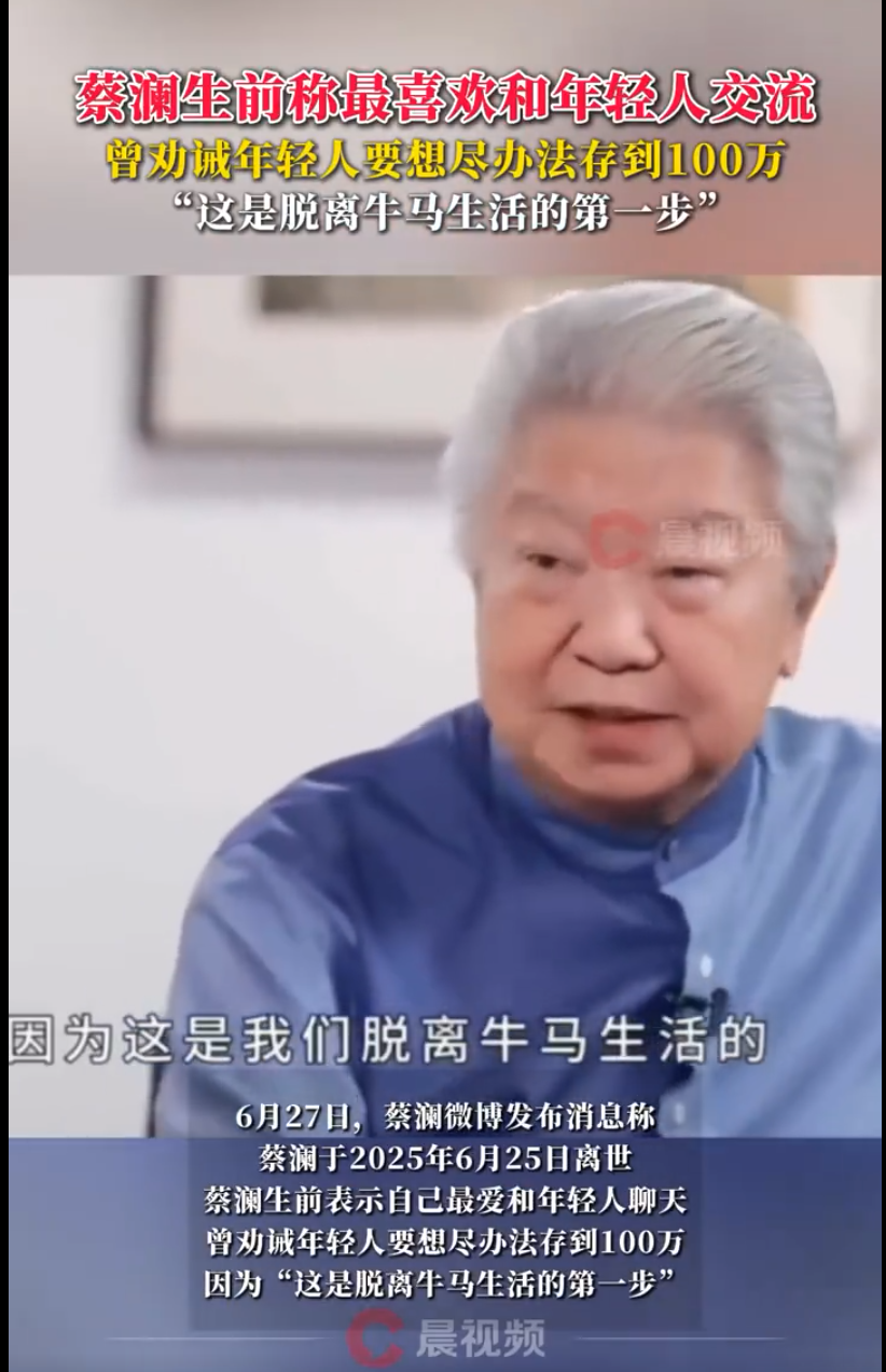 蔡澜生前表示自己最爱和年轻人聊天,曾劝诫年轻人要想尽办法存到100万,因为“这是脱离牛马生活的第一步”。