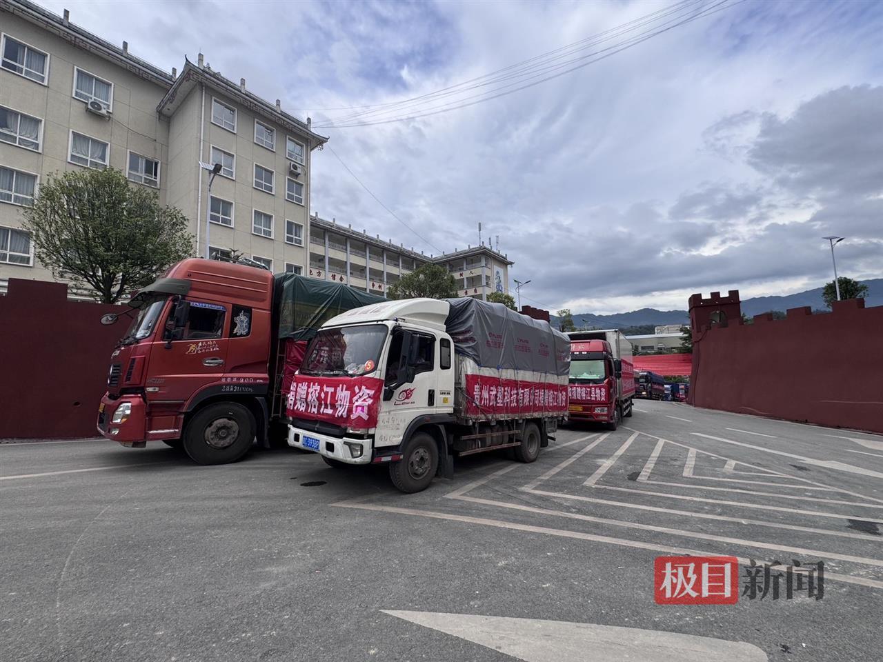 近期,贵州省黔东南州榕江县两度遭遇洪水侵袭,受到全国人民关注。一方有难,八方支援。榕江县城共有两个物资捐赠接收点位,榕江中等职业学校是其中之一。7月1日,极目新闻记者在榕江中等职业学校看到,拉着捐赠物资的货车在校园里排成长队,校园里物资堆成小山,志愿者将捐赠而来的物资卸下,又将县城受灾地区急需的物资搬上车。