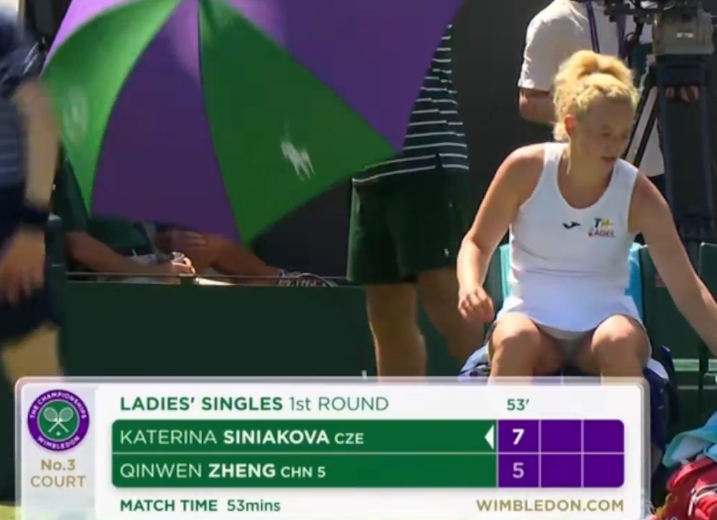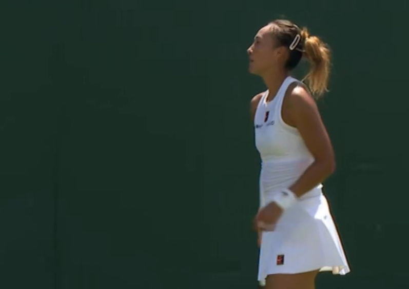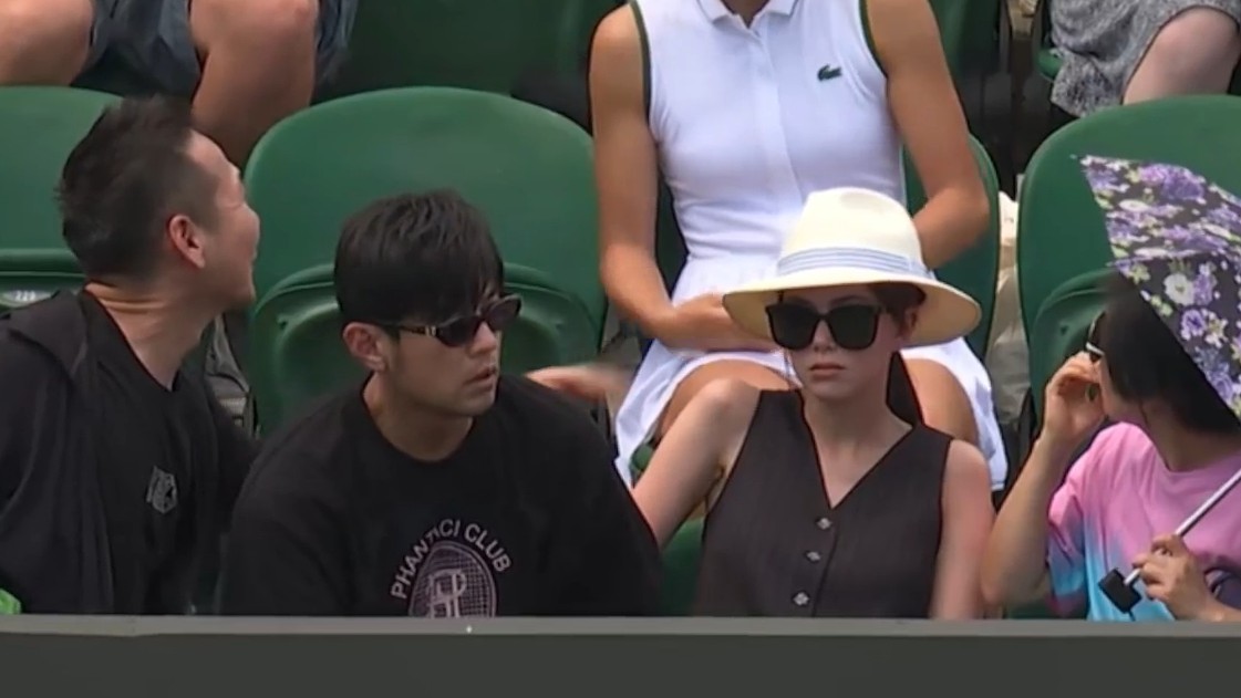 7月1日,温网女单首轮,周杰伦、昆凌现身3号球场观众席,观看郑钦文对阵西尼亚科娃的比赛。