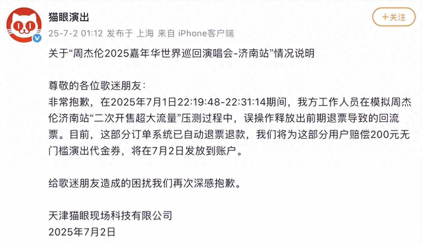 非常抱歉,在2025年7月1日22:19:48-22:31:14期间,我方工作人员在模拟周杰伦济南站“二次开售超大流量”压测过程中,误操作释放出前期退票导致的回流票。目前,这部分订单系统已自动退票退款,我们将为这部分用户赔偿200元无门槛演出代金券,将在7月2日发放到账户。
