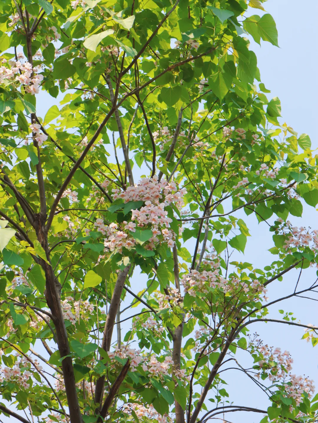 原来,这些高大的树是楸树,这些修长弯曲的果实学名为“结痂果”,是楸树的独特标志,其外形酷似日常所见的豇豆,成为夏日园中一道别致的风景线。