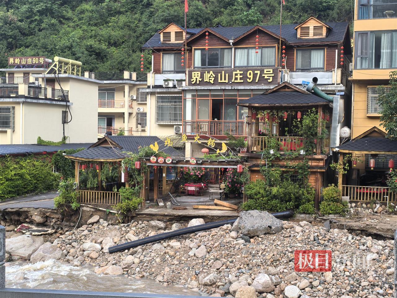 沿蛇尾河一路上山,河道两旁全是各色民宿。虽然大部分房屋外观完好,但不少房屋的地基随着路基垮塌而塌了部分。