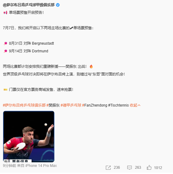 7月4日,据萨尔布吕肯乒乓球甲级俱乐部消息, 8月31日和9月14日两场主场比赛都计划安排重磅新援樊振东出战。