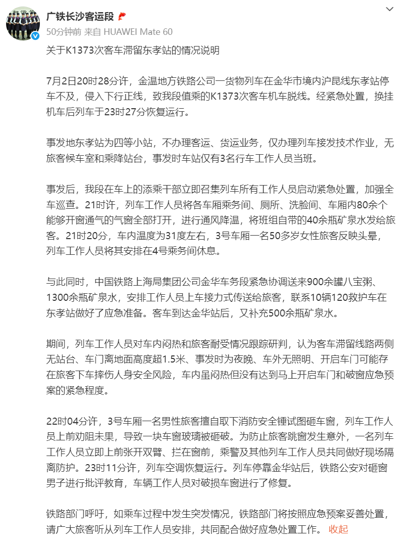 @广铁长沙客运段 消息,7月2日20时28分许,金温地方铁路公司一货物列车在金华市境内沪昆线东孝站停车不及,侵入下行正线,致我段值乘的K1373次客车机车脱线。经紧急处置,换挂机车后列车于23时27分恢复运行。