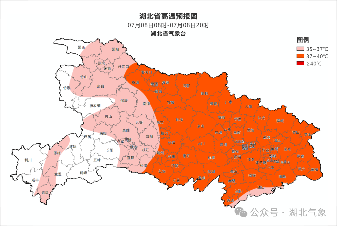 预计7月8日白天,除西部高山地区外,我省大部分地区最高气温将升至35℃以上,其中襄阳、随州、荆门、荆州、天门、潜江、仙桃、武汉、孝感、鄂州、黄冈、黄石、咸宁可达37℃以上,局地40℃,请注意防范。