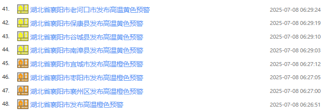 襄阳市气象台2025年07月08日06时26分发布高温橙色预警信号:预计今天白天,襄阳市区大部街道(乡镇)最高气温将升至37℃以上,局部39℃以上,请注意防范。