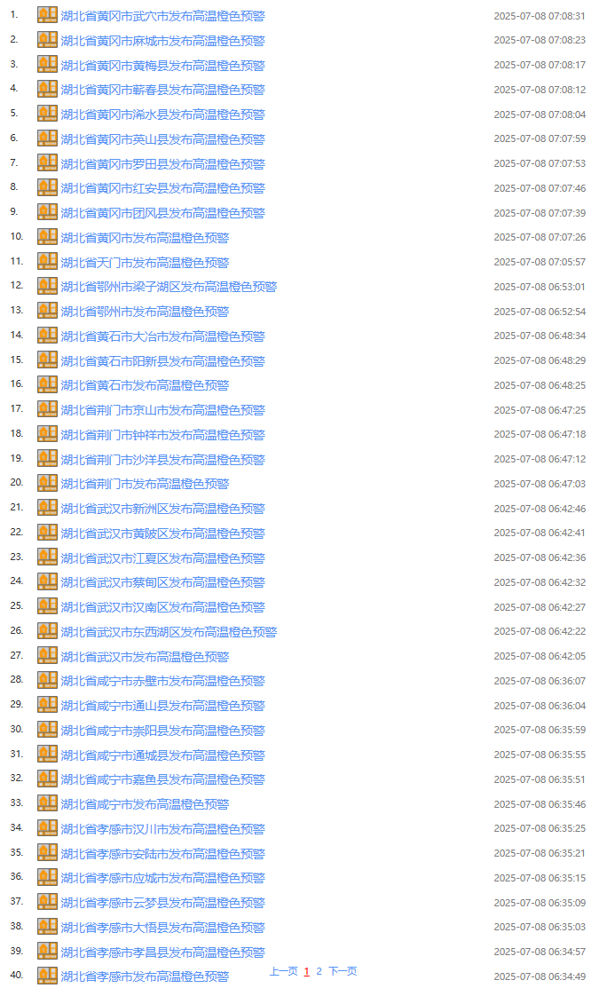 武汉市气象台2025年07月08日06时42分发布高温橙色预警信号:预计今天白天,武汉大部分街道(乡镇)最高气温将升至37℃以上,局地40℃以上,请加强防范。