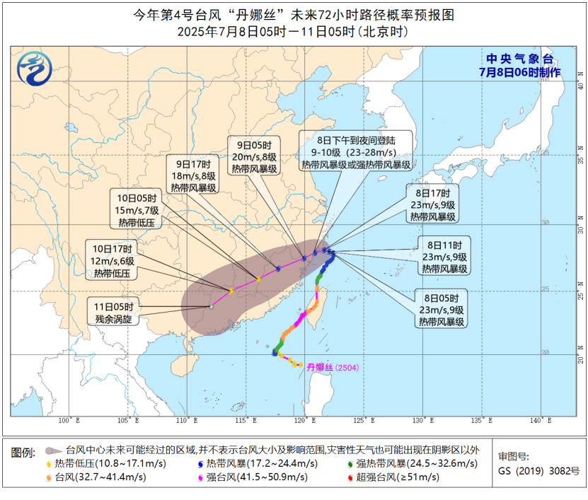 大风预报:7月8日8时至9日8时,东海及钓鱼岛附近海域、台湾以东洋面、浙江沿海、福建沿海、上海沿海、江苏东南部沿海、长江口区、台湾岛沿海、广东东部沿海、台湾海峡、巴士海峡、南海东北部和西南部将有6至7级大风,阵风8至9级,其中“丹娜丝”中心经过的附近海域和地区风力可达8至10级、阵风11至12级。