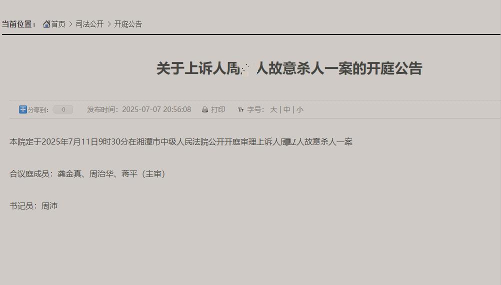 2025年1月9日上午,“湘潭大学宿舍投毒案”在湘潭市中级人民法院开庭审理。4月7日,该案一审宣判,周某某以故意杀人罪被判处死刑,剥夺政治权利终身。