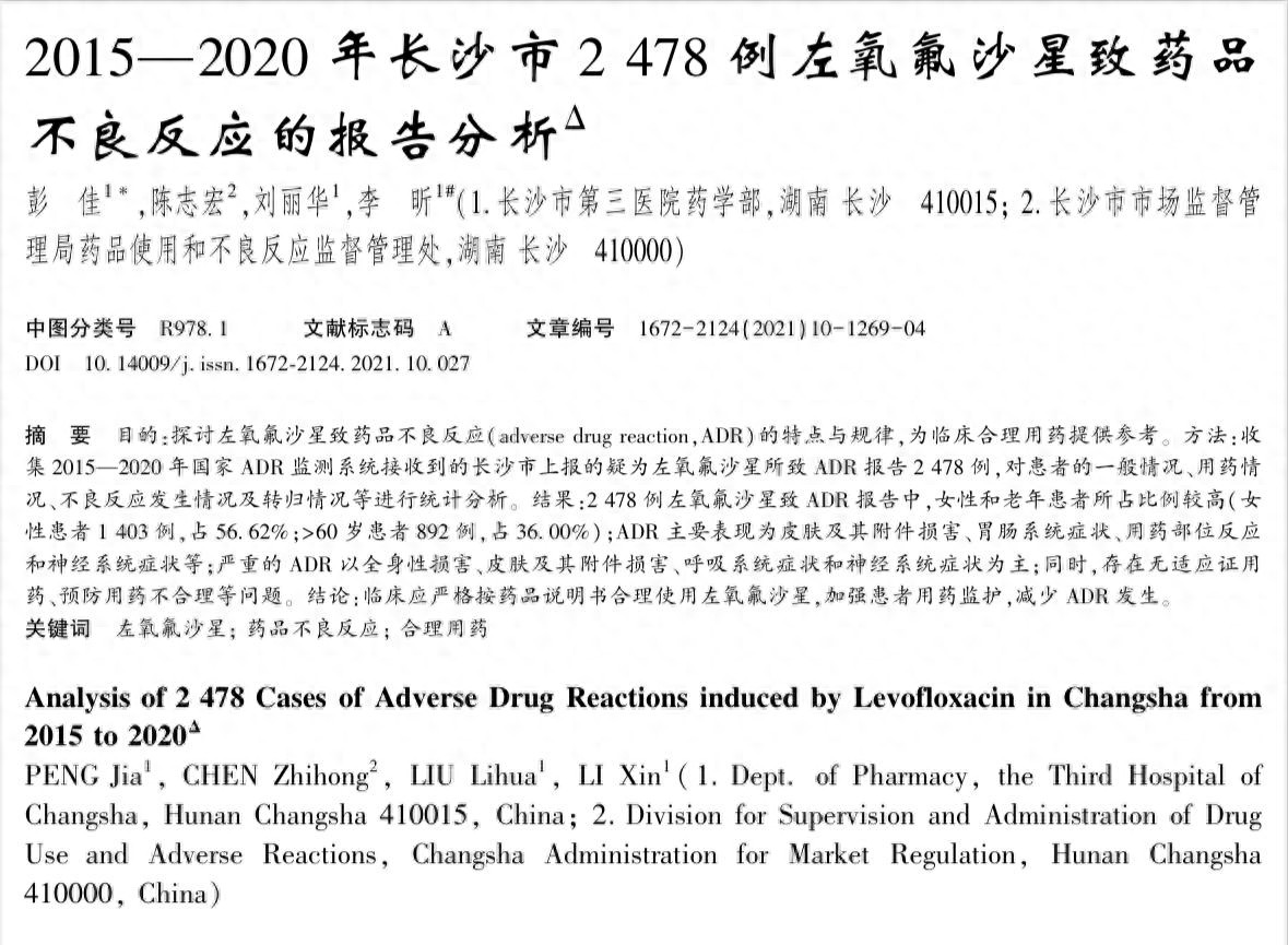 湖南省长沙市第三医院主任药师刘丽华于2021年10月在《中国医院用药评价与分析》发表了一篇名为“2015—2020年长沙市2478例左氧氟沙星致药品不良反应的报告分析”的文章。文中提到,左氧氟沙星导致的药品不良反应中,女性患者、60岁以上患者占比较高,不良反应累及皮肤、胃肠道、神经系统、心血管系统等。因被广泛用于临床,该药不良反应上报数量逐渐增多,严重的不良反应可导致病情延长,甚至威胁患者生命。刘丽华介绍,曾有老年患者在服用氟喹诺酮类药物后出现幻视,停药后恢复正常。除此之外,还可能出现一些比较罕见的不良反应,如跟腱断裂、主动脉夹层甚至过敏性休克。