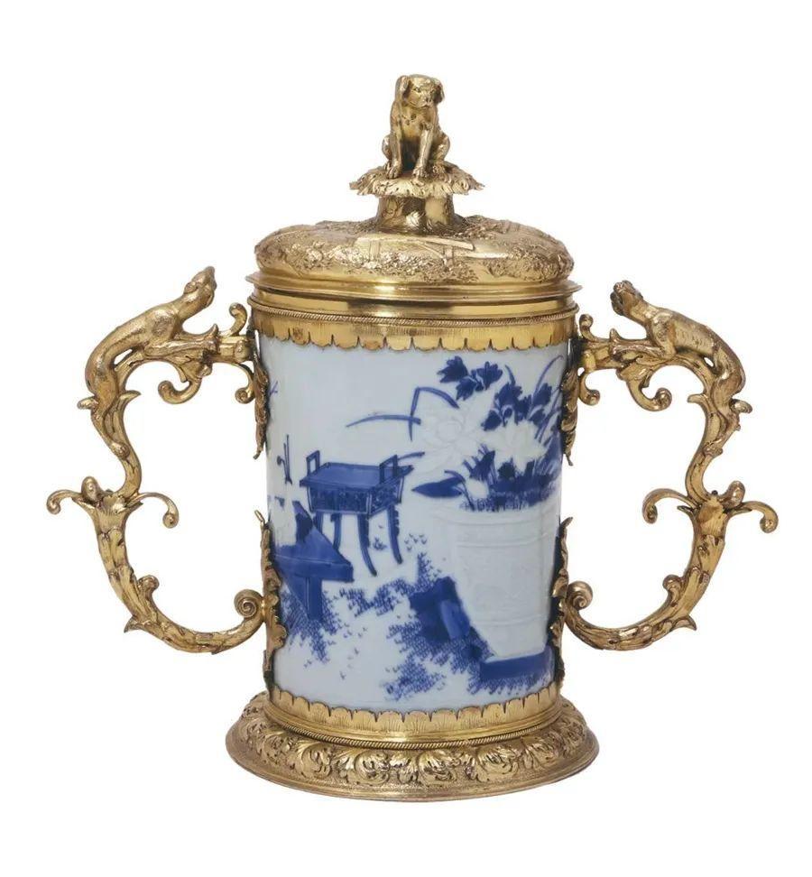 2021年,上博举办的“东西汇融——中欧陶瓷与文化交流特展”中,就有不少这样的展品。比如一件明代景德镇窑瓷器“青花博古图笔筒”就在英国用银镀金镶嵌,改造成一件西式的盖杯。这种再装饰行为并不等于有网友所称的“糟蹋文物”。