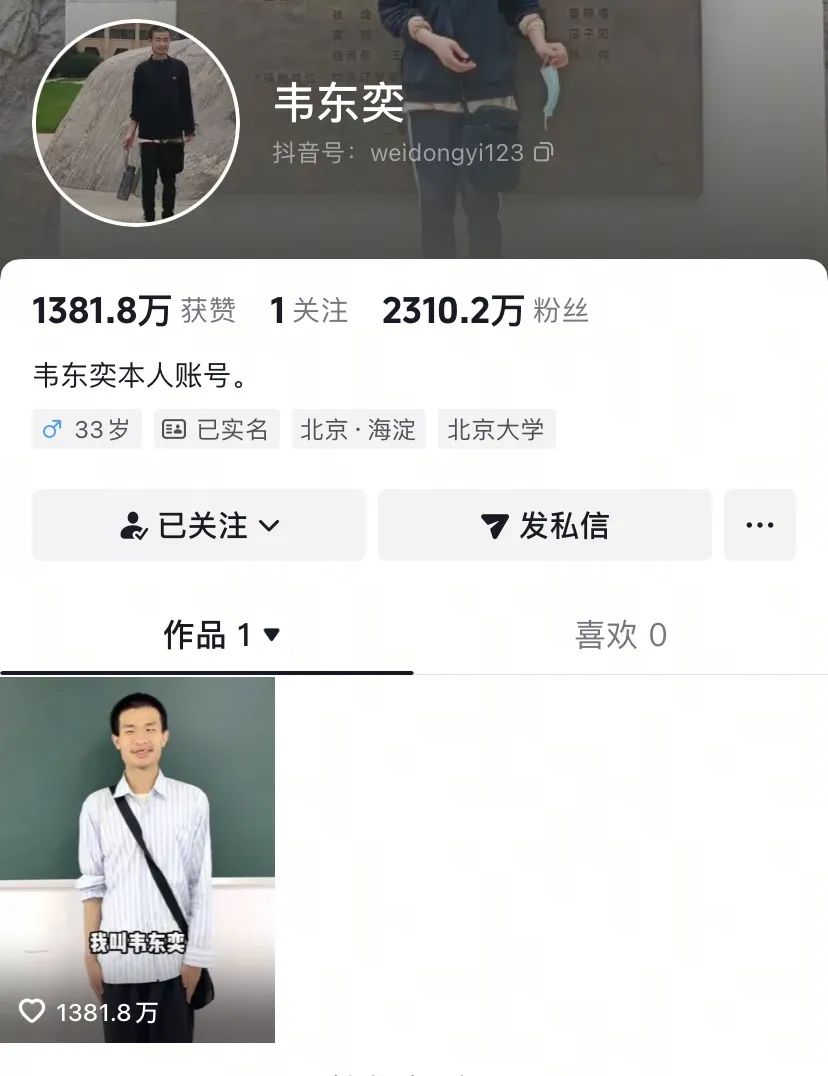 高考前夕,北京大学数学科学学院研究员韦东奕在社交平台上开设个人账号,发布了一条时长仅为4秒的视频,引发网友的强烈关注。截至6月9日10时30分许,韦东奕账号粉丝已突破2310万。