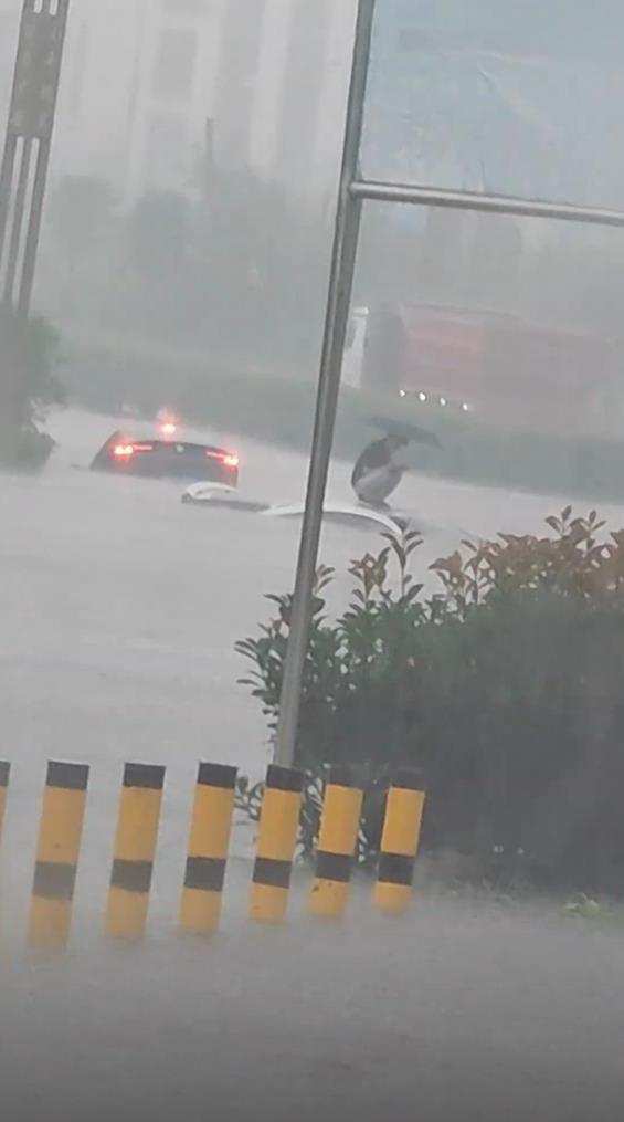 视频显示,现场下着大雨,一名男子打着伞蹲在车顶,周边积水眼看就要没过车顶。