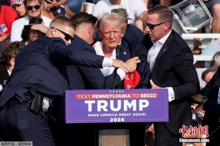 资料图:综合外媒消息,当地时间2024年7月13日下午,特朗普在宾夕法尼亚州举行竞选集会发表演讲时,现场响起枪声。画面显示,特朗普右耳有血迹。图为特朗普在特勤人员保护下撤离演讲台。